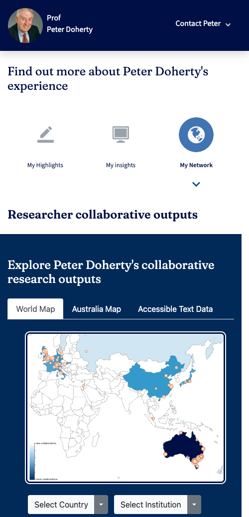 Researcher Profile Page: The core destination containing scholarly works, supervision availability, and contact information.